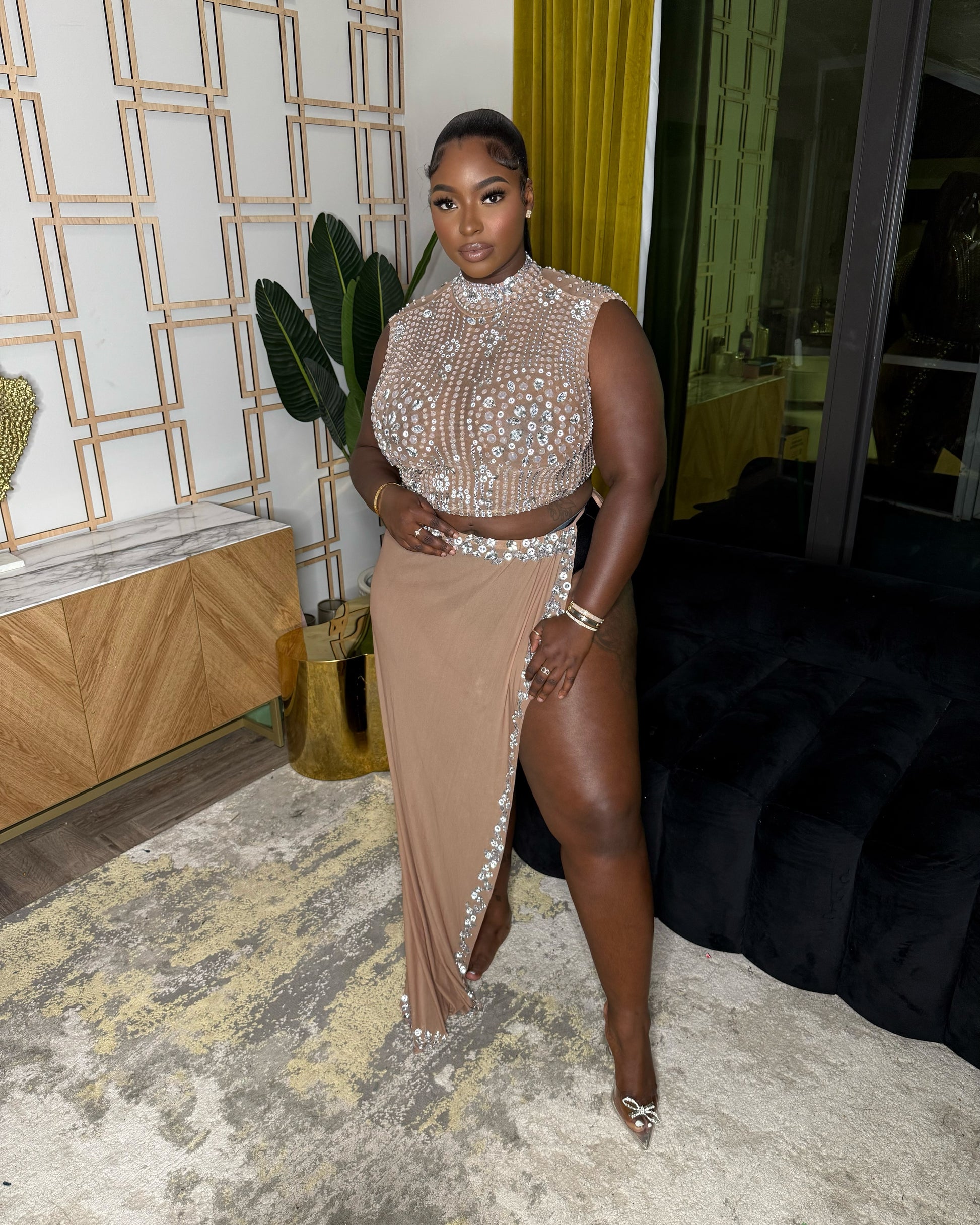 The Tania Set is the epitome of elegance and glamour. The sleeveless, high-neck crop top, made from a sheer mesh-like fabric, is fully embellished with sparkling rhinestones or crystals for a dazzling effect. The snug, tailored fit accentuates your figure, while the high-slit maxi skirt, with matching crystal detailing, adds a touch of sophistication. The soft, nude-toned or taupe fabric with a slight sheen and asymmetrical wrap-style design will show off your left leg in the most flattering way. Elevate your style with the Tania Set.